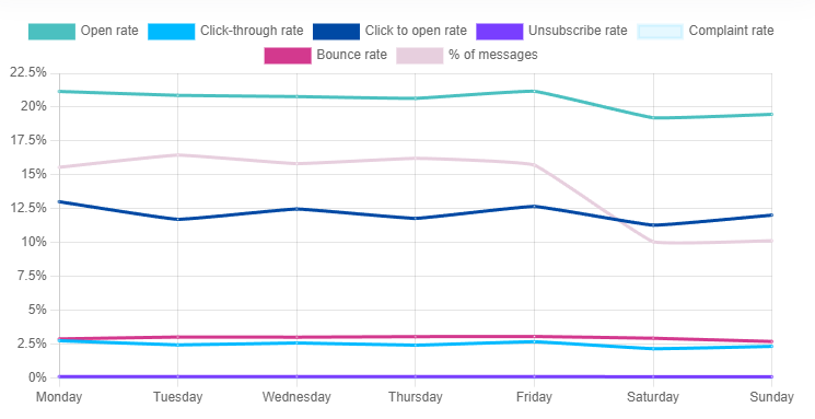 Deciding on which day of the week is as important as determining a good time to schedule your newsletters. Recent studies show that whilst weekdays have a similar open rate, there is a slight drop-off at the weekends: